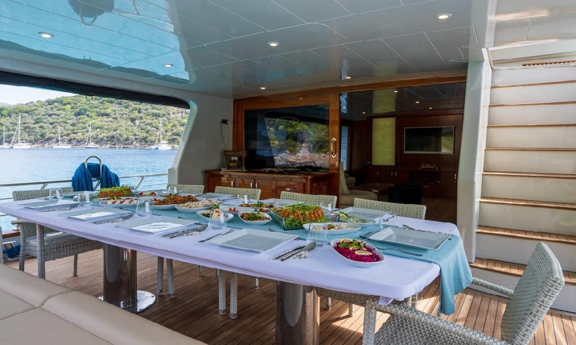 Notre chef expérimenté prépare trois repas frais par jour : petit-déjeuner, déjeuner et dîner. Le petit-déjeuner turc comprend une variété de fromages, olives, œufs, pâtisseries et fruits frais. Les déjeuners et dîners proposent une cuisine méditerranéenne, des fruits de mer frais et des spécialités locales. Nous pouvons répondre aux restrictions alimentaires si elles sont communiquées à l'avance. Tous les frais de nourriture et de boissons sont gérés via l'APA (Avance sur Provision), qui représente généralement 30% du prix de la location.