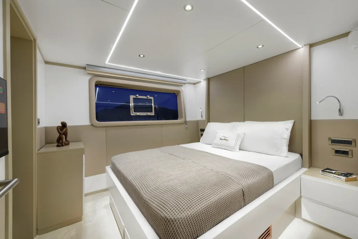 Tanway, 4 kabinli ve 9 misafire kadar çıkan 26 metrelik bir motoryat. Mevcut kayıtta 4 kişilik ekip, 7,2 genişlik ve yaklaşık 12 knots seyir hızı görünüyor. Teknede klima bulunuyor; bu özellikle yaz ortası charter planlarında pratik bir avantaj sağlıyor. Bu ilanda en net görünen rota alanı Marmaris, Fethiye, Göcek, Bodrum, Yunan Adaları.